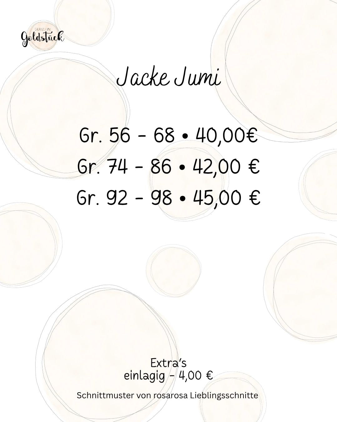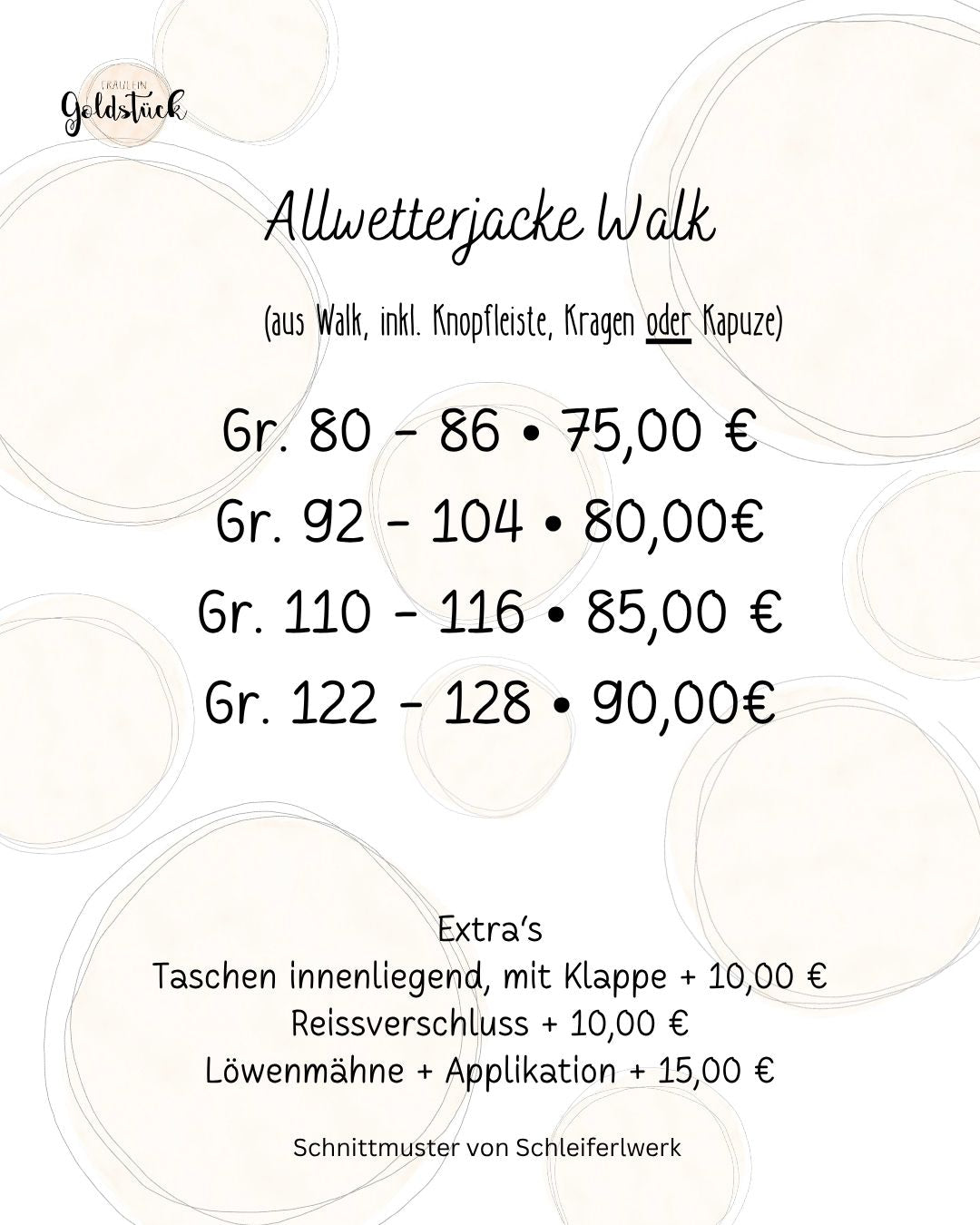 Die meisten Kleidungsstücke sind Einzelstücke, d.h. ich fertig sie einmalig in der jeweiligen Größe an. Meist ist aber noch genug vom diesem Stoff vorrätig, so dass ich weitere Kleidungsstücke in der passenden Größe nähen kann.
