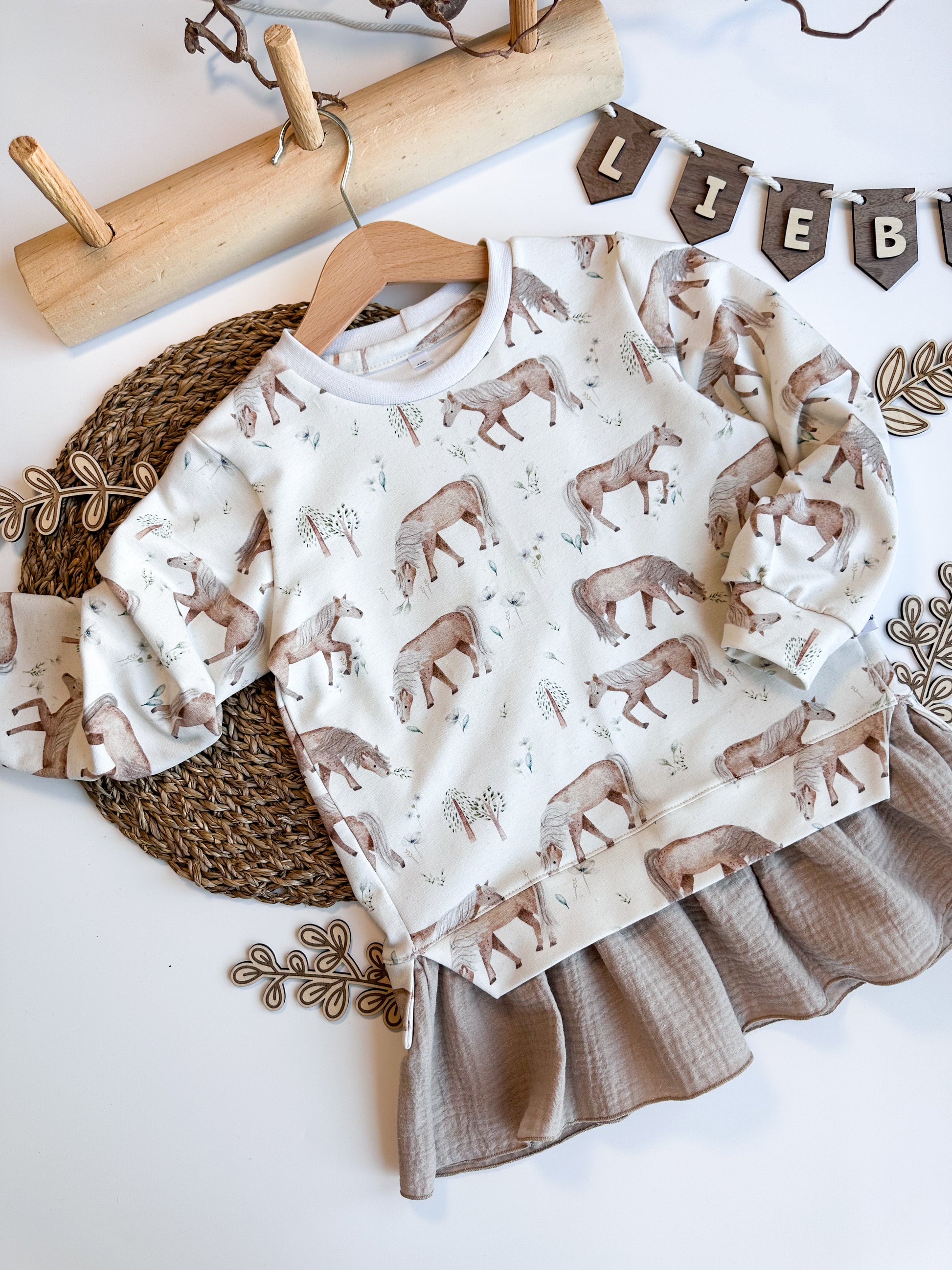 Oberteil ist aus Waffeljersey genäht, das Rockteil aus Musselin.