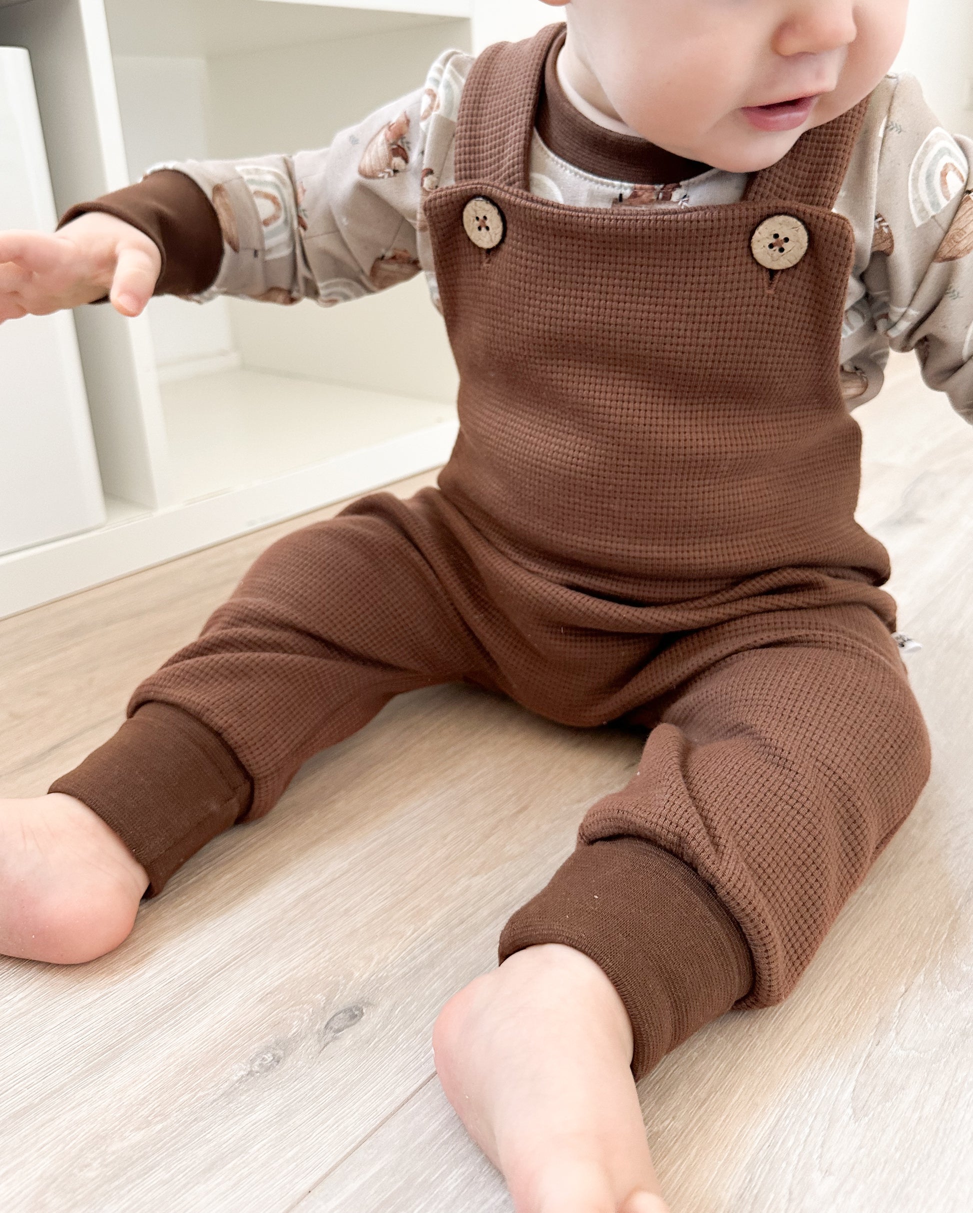 Alle Knöpfe am Kleidungsstück werden von mir ordnungsgemäß mit der Nähmaschine angenäht und verriegelt. Es kann trotzdem vorkommen, dass sich Knöpfe nach starker Belastung lösen. Dies stellt eine Verschluckungsgefahr dar sollte sich dein Kind diesen in den Mund stecken.