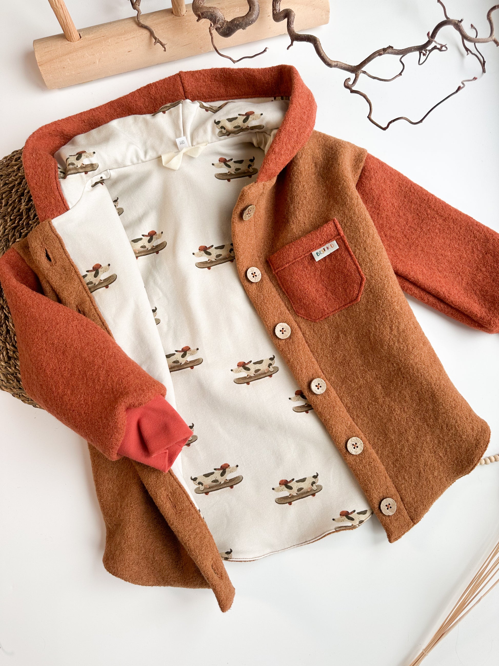 Alle Knöpfe am Kleidungsstück werden von mir ordnungsgemäß mit der Nähmaschine angenäht und verriegelt. Es kann trotzdem vorkommen, dass sich Knöpfe nach starker Belastung lösen. Dies stellt eine Verschluckungsgefahr dar sollte sich dein Kind diesen in den Mund stecken.